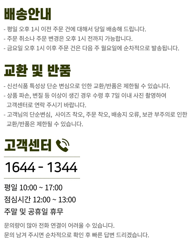 · 발주 마감 후 단순 변심, 잘못 주문, 주소 오류 등 사유로 인한 반품은 제한됩니다. (13시 발주 마감)