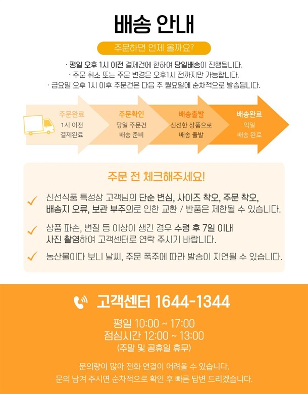 · 발주 마감 후 단순 변심, 잘못 주문, 주소 오류 등 사유로 인한 반품은 제한됩니다. (오전 10시 발주 마감)