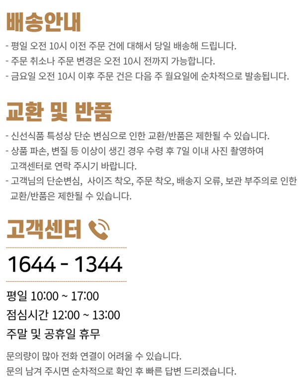 · 발주 마감 후 단순 변심, 잘못 주문, 주소 오류 등 사유로 인한 반품은 제한됩니다. (오전 10시 발주 마감)